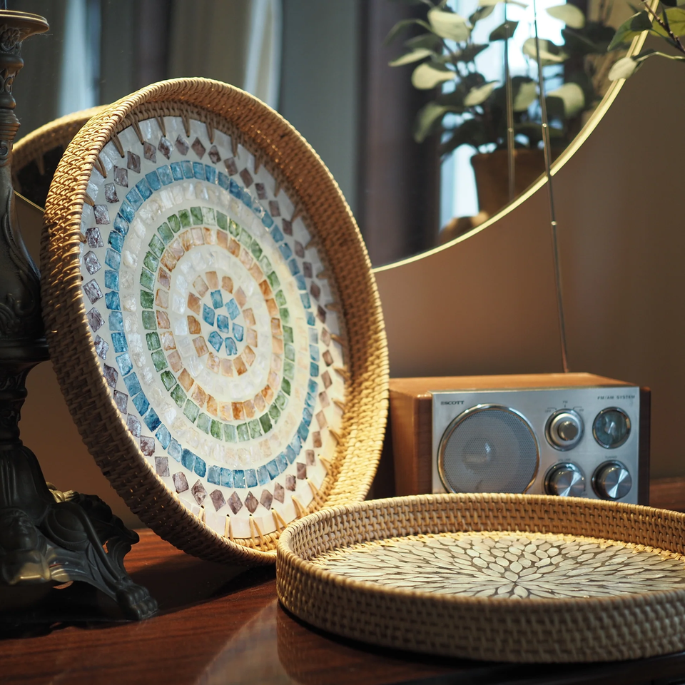 Nouveauté : Plateau en rotin et nacre antique, 2 pièces, pour décoration de maison de luxe, idéal pour table à manger, plateau à fruits/pain, artisanat.