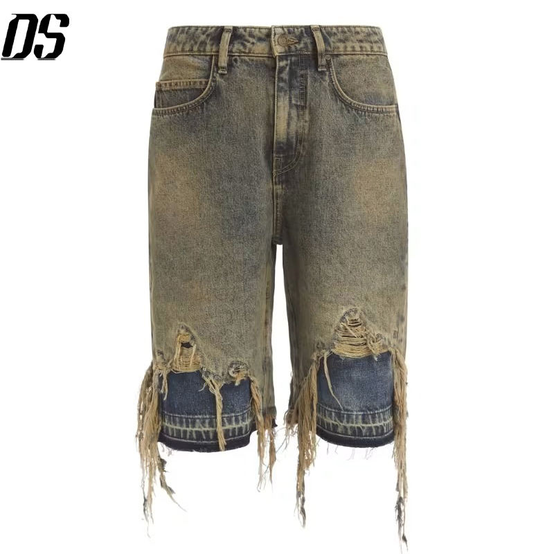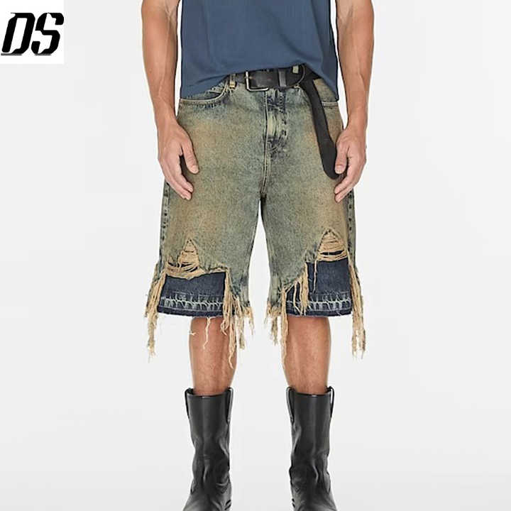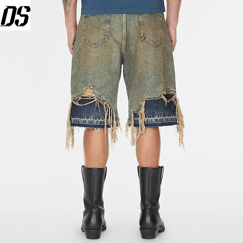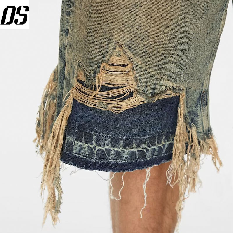 Nouvelle Arrivée Short en Jean Rétro Délavé Effet Usé Coupe Droite Ample et Déchiré pour Homme Taille Moyenne