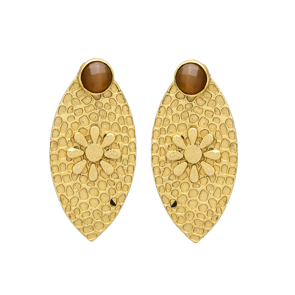 Boucles d'oreilles feuille d'or texturées nouvelle arrivée avec pierres précieuses calcédoine brune