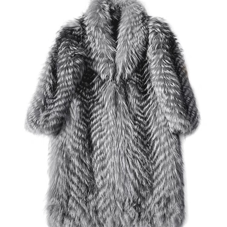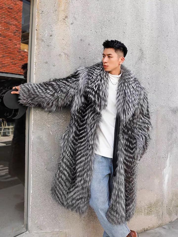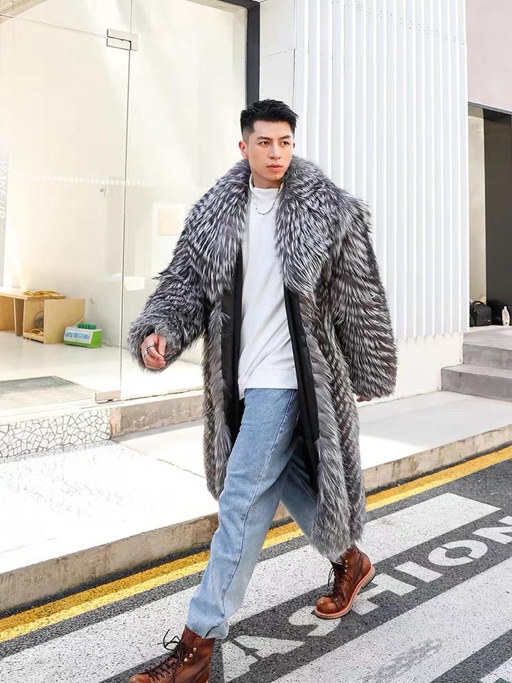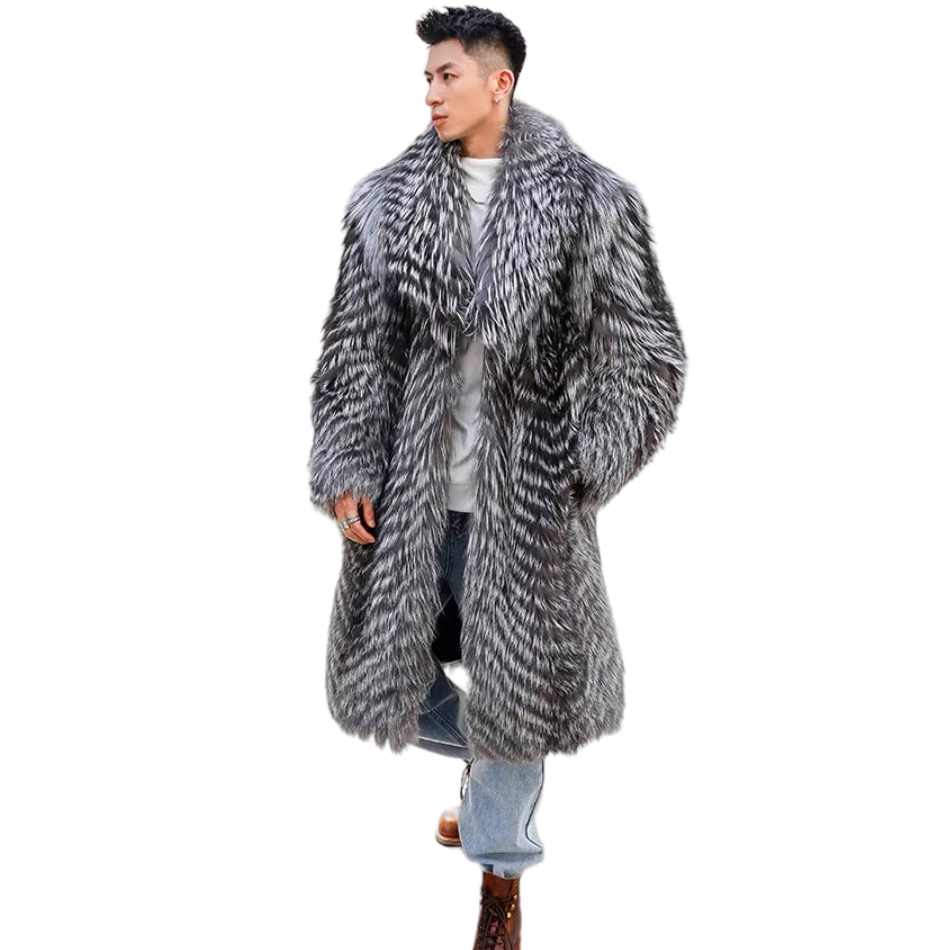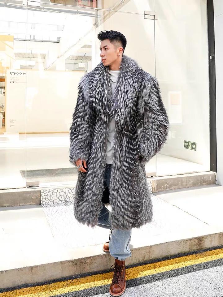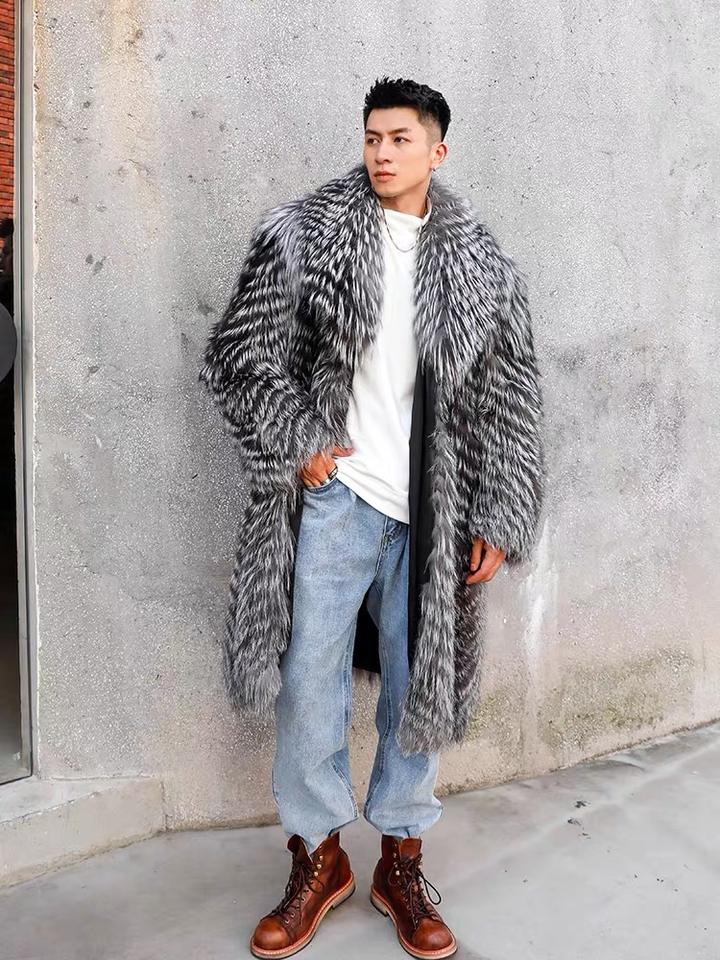 Nouveauté Manteaux de fourrure bon marché pour hommes tendance Vêtements de trench Manteau de fourrure de renard argenté moelleux pour hommes chaud taille longue