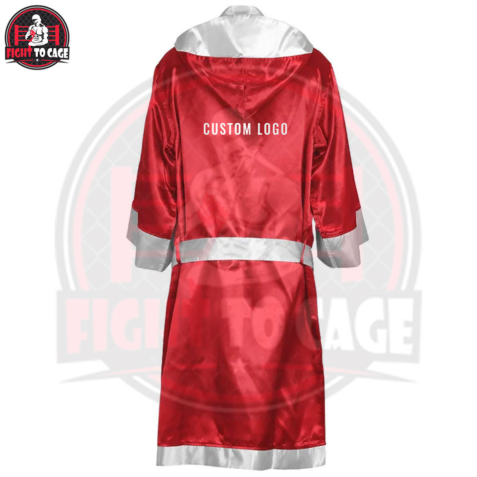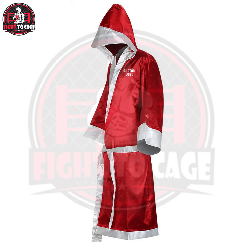 Nouvelle Arrivée Robe de Boxe Unisexe Rouge en Satin de Polyester avec Capuche, Logo Personnalisé Imprimé, Durable et Respirante, Robe d'Entrée de Boxe