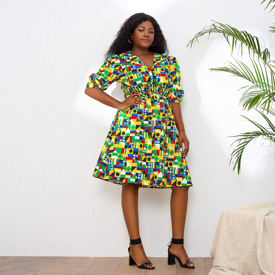 Nouvelle arrivée Robe mi-longue en tissu africain Ankara Wax en polyester à col en V et manches courtes pour femmes