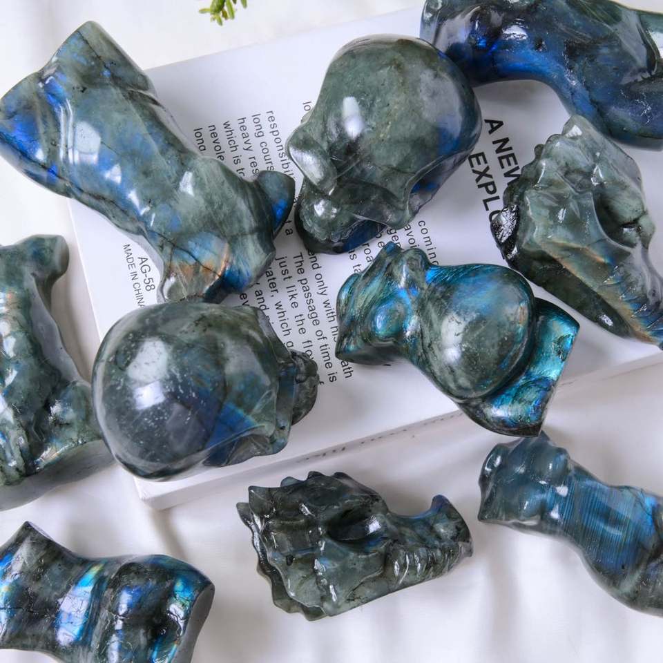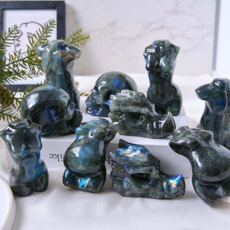 Nouvel Arrivage Décoration Sculptée en Cristal de Labradorite Naturelle Vintage, Motif Tête de Dragon et Crânes de Corps Féminin