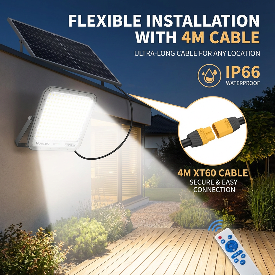 Nouveauté : Projecteur solaire étanche IP66 200w avec panneau mono 180 ° Réflecteur Nano-PC pour stades, jardins, entrepôts