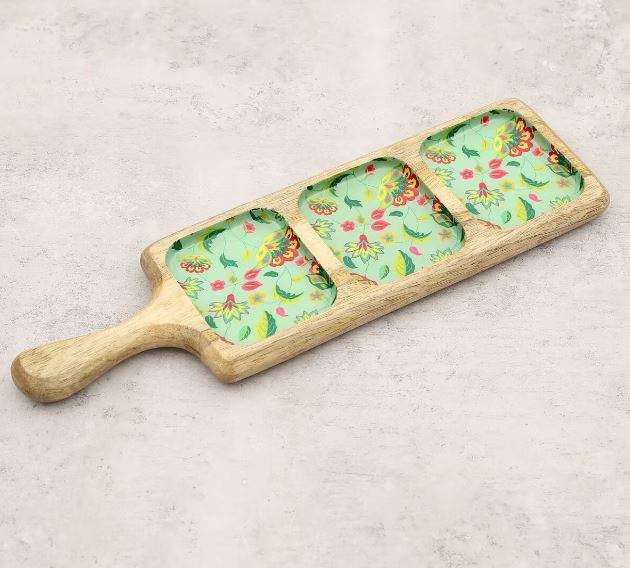 Nouvelle arrivée pour plateau à compartiment en bois de manguier pour servir des noix, des dattes et des desserts, émail imprimé pour le ramadan et le diwali