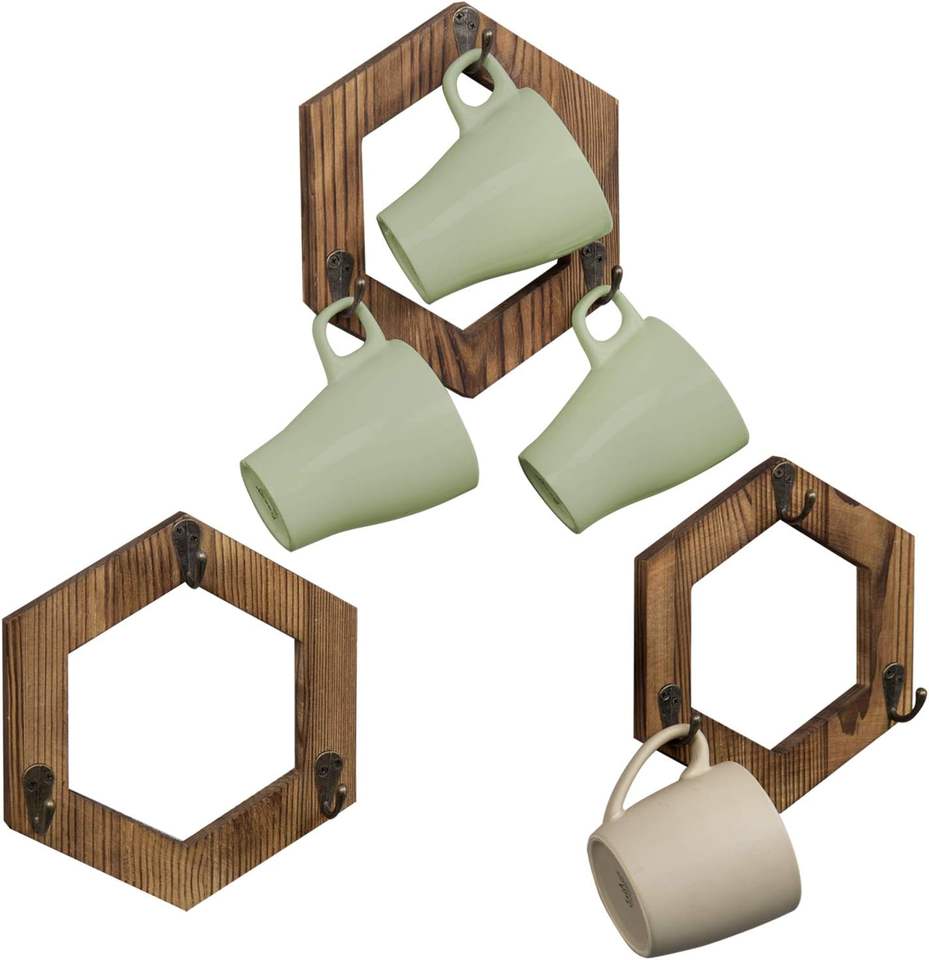 Porte-tasses à café suspendu avec 3 crochets et motif géométrique hexagonal, support mural pour tasses et mugs