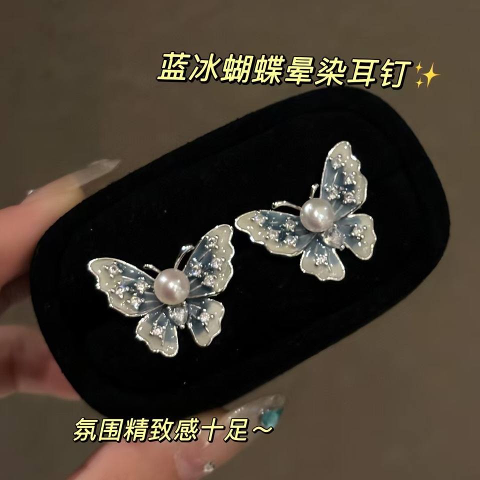 New Blue Ice Butterfly Freshwater Pearl Earrings Pure Silver Fashion Earpin Earnail Enamel Natural Freshwater Jewelry Eardrop