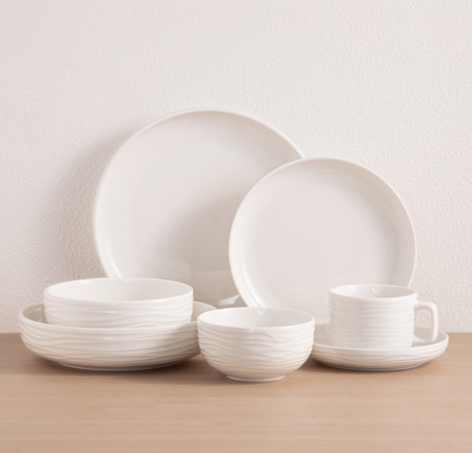 Nouvel ensemble de vaisselle en porcelaine fine blanche, assiettes, bols, tasses et soucoupes à bord ondulé texturé, pour cuisine moderne, hôtels et restaurants, vente en gros