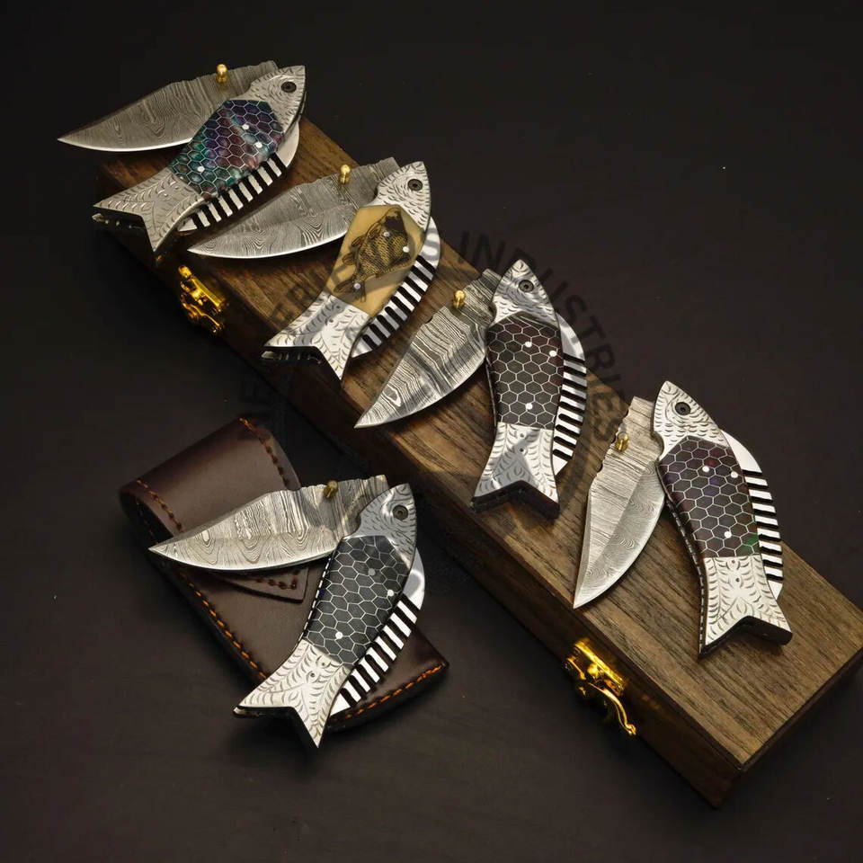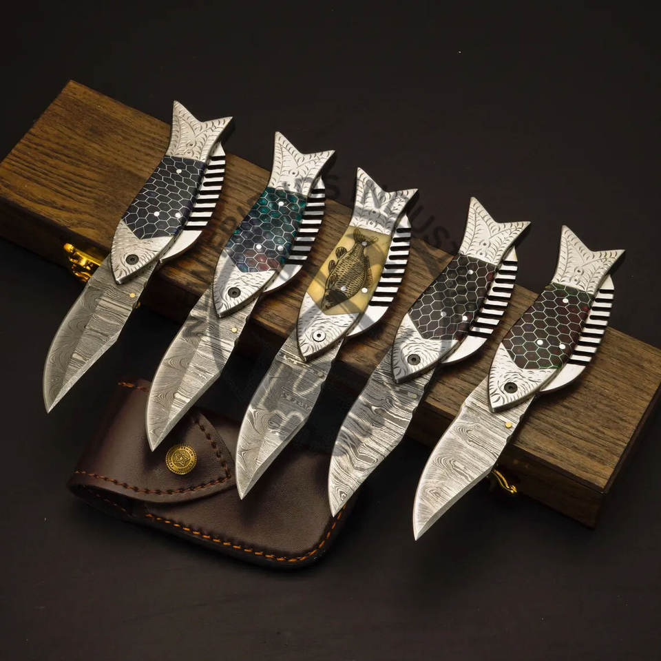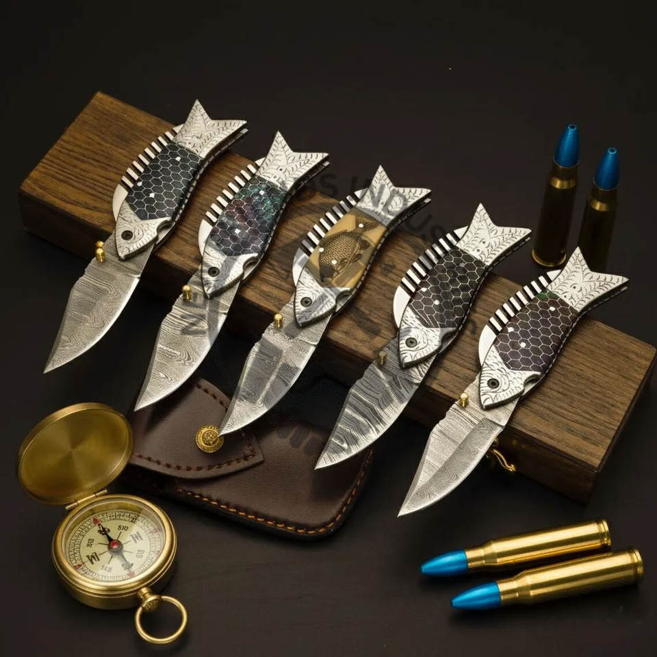 Nouveau Couteau de Pêche Artisanal Personnalisé, Couteau de Poche en Acier Damas avec Manche en Résine Nid d'Abeille, Couteau Pliant Gravé, Cadeau Personnalisé