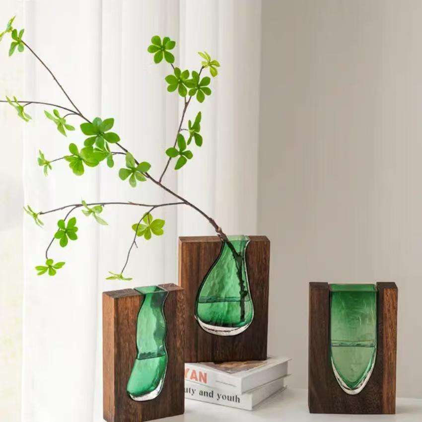 Nouveau vase en verre de style chinois en bois massif, associé à du verre vert en forme de larme pour une décoration intérieure élégante