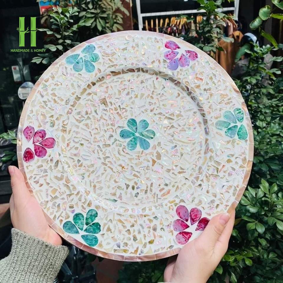 Nouveau choix d'assiettes rondes incrustées de nacre OEM variété de modèles assiettes décoratives personnalisées plateaux de service