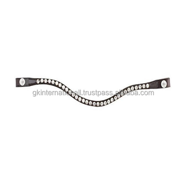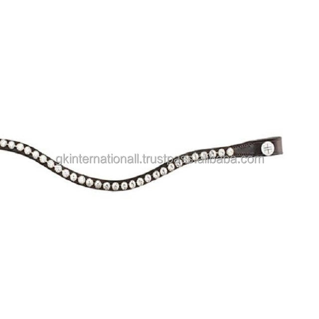 Nouvelle bande de front de cheval en cuir noir en forme de vague de conception personnalisée avec bande de front décorative de chaîne en métal de cristaux clairs de marque ronde