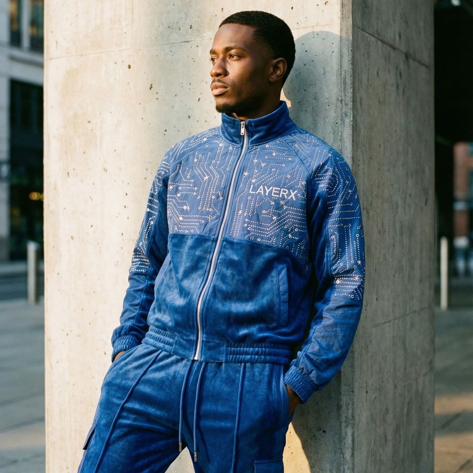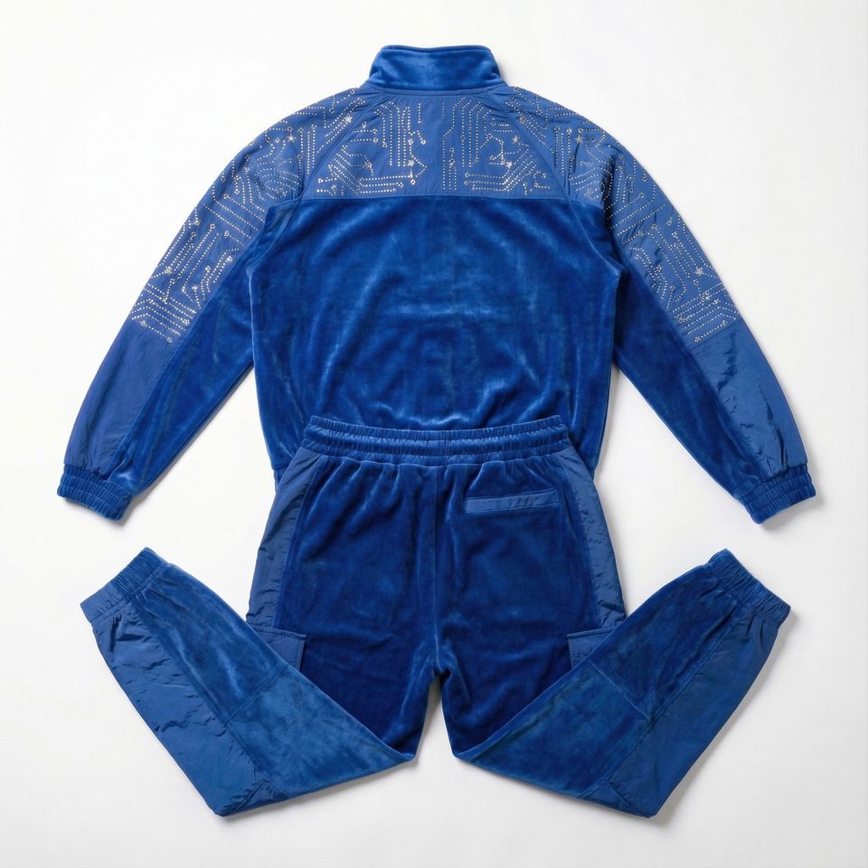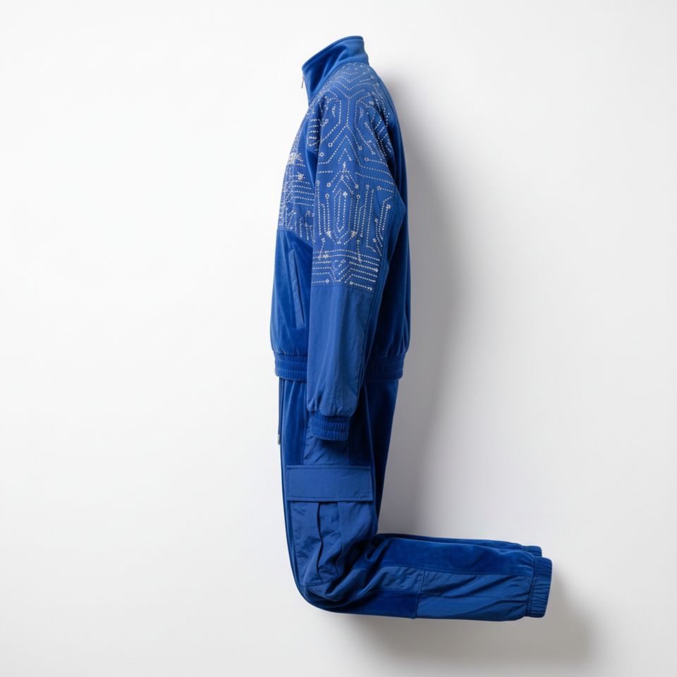 Ensemble deux pièces streetwear homme Y2K en nylon/coton épais délavé, imprimé bleu, orné de strass, style technique et éco-responsable