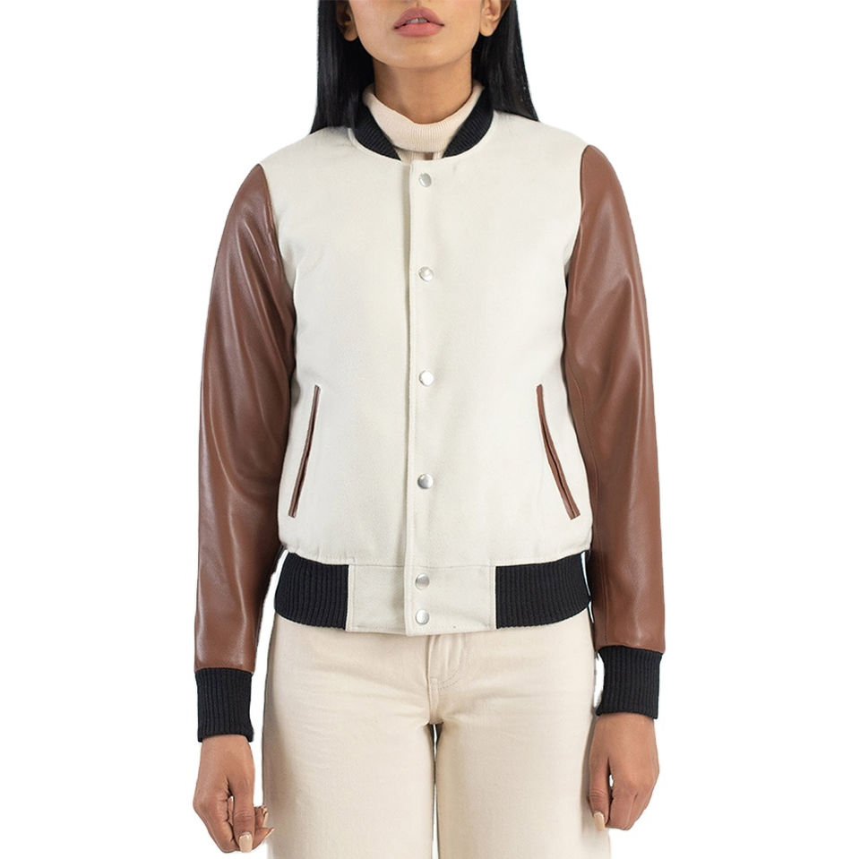New Custom Women Varsity Jacket Wool Body Bright White Leather Sleeves Letterman Jacket Baseball women's jackets Varsity 2025