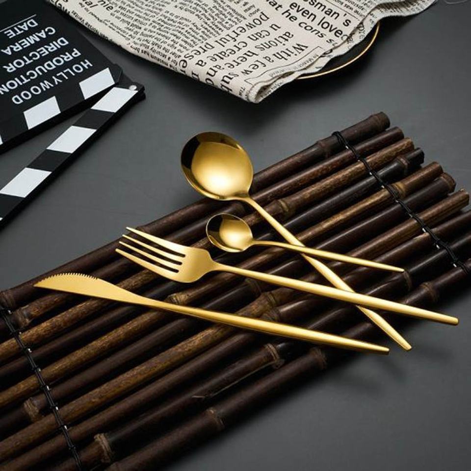 Nouveau personnaliser brillant longue poignée Unique en acier inoxydable or miroir poli cuillère fourchette et couteau ensemble de couverts de mariage
