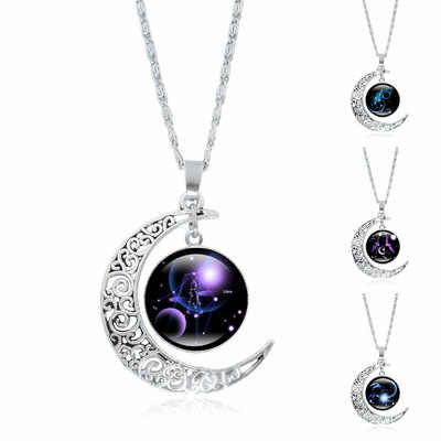 Nouveau collier personnalisé DIY avec les 12 signes du zodiaque, collier tendance avec pendentif en forme de croissant de lune en verre luminescent dans le noir pour femmes et hommes, cadeaux
