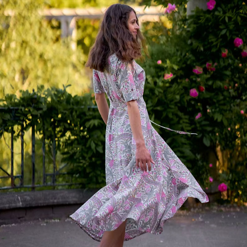 New Daffodil Vintage Cotton Blend Hand Block Printed Holiday Dress White Pink Floral Summer Handmade Ethical Natural Washable