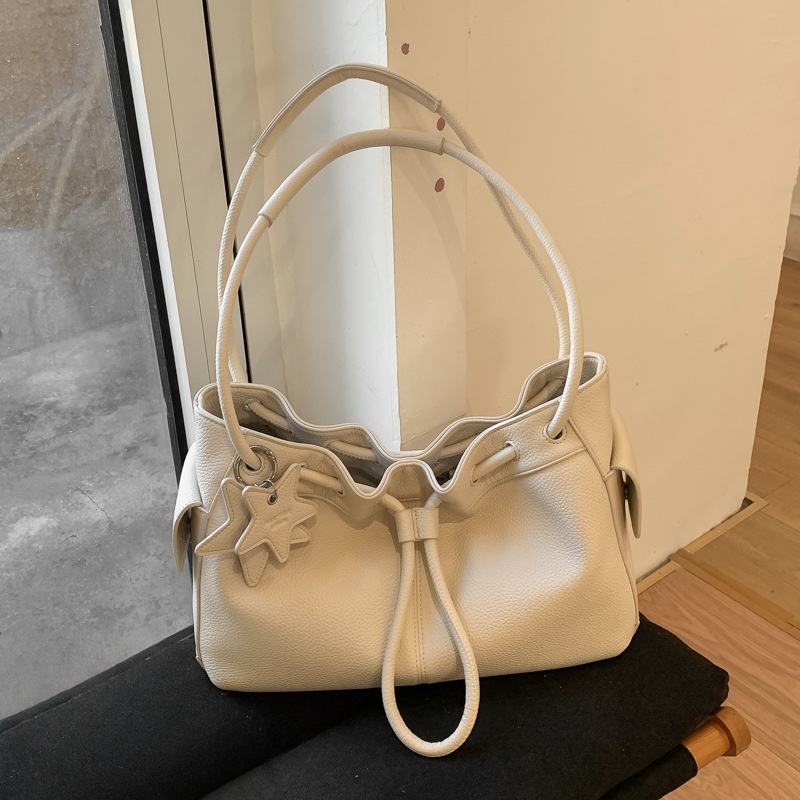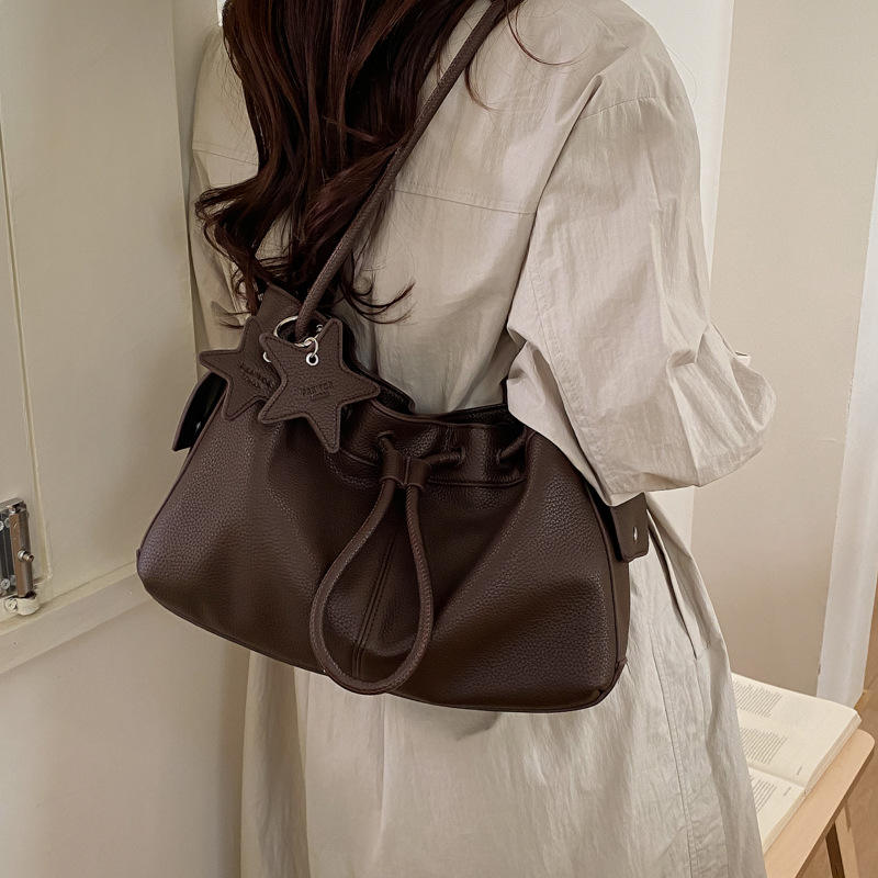 New Dark Brown Lychee Pattern Star Charm Drawstring Bag for Women Exquisite Quality Products Handbag Minimalism Shoulder Bag
