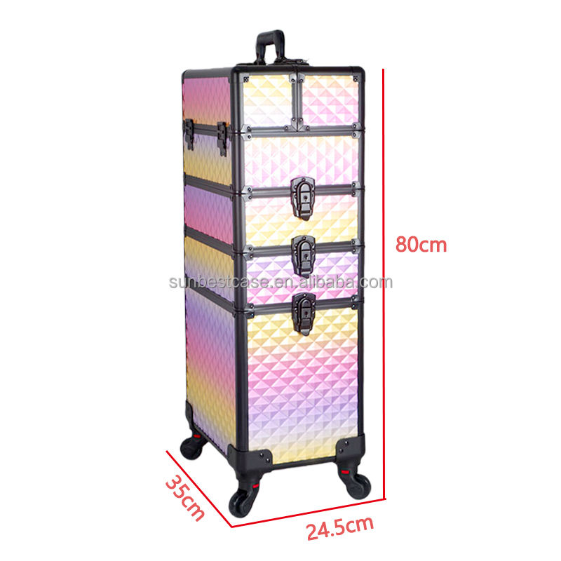 Nouvelle conception, valise à roulettes de maquillage 4 en 1, chariot avec divers compartiments et roues pour les artistes maquilleurs et les professionnels de la beauté