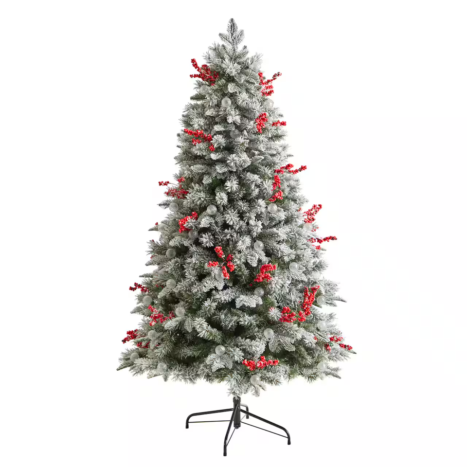 Nouvelle conception, sapin de Noël artificiel pré-éclairé de 1,8 m avec lumières LED, neige tombante, fruits rouges en PVC, mélange de PE, sapin de Noël