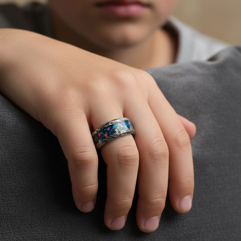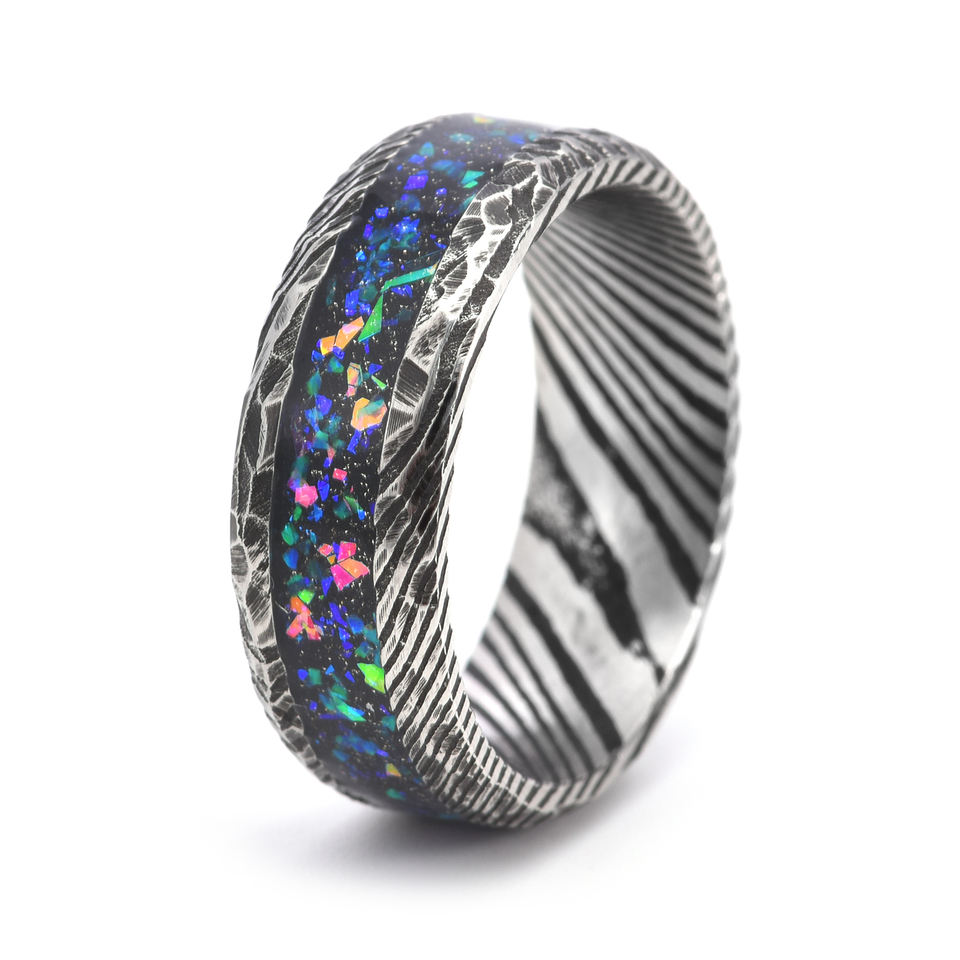 Nouvelle conception, bague en acier damas tendance de 8 mm, incrustation d'opale galactique, plaquée noire, pour homme, femme, unisexe, alliance, bague de fiançailles, bijoux