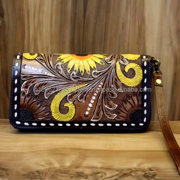 Nouveau Design Sculpture Main Usiné Portefeuille Embrayage Élégant En Cuir Véritable Nouveau Design Portefeuille Multi Utilisations Western Portefeuilles En Cuir