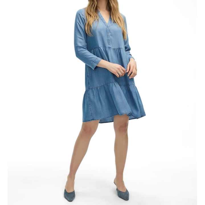 Nouvelle Robe Courte en Jean Décontractée pour Femme, Col en V, Manches Longues, Coupe Ample, avec Boutons et Volants, Bleu Jean