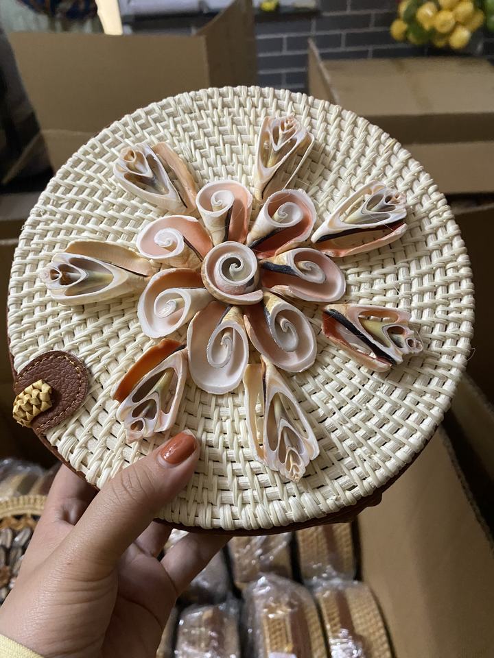 New Design Circle Rattan Straw Handmade with Seashell / Bleached Rattan Crossbody Bag with Leather Handle for Party Daily Gift