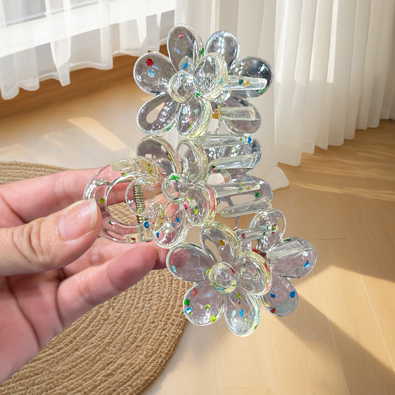 Nouvelle conception créative en résine plastique, grande pince à cheveux à 3 fleurs pour femmes, pince à cheveux florale estivale douce à dégradé de couleurs