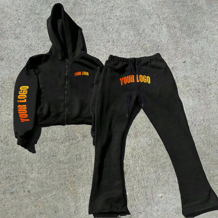 Nouvelle conception, impression d'écran personnalisée, ensemble de survêtement unisexe d'hiver en 2 pièces, écologique, coupe-vent, pantalon de survêtement évasé, sweat à capuche zippé, ensemble de jogging OEM