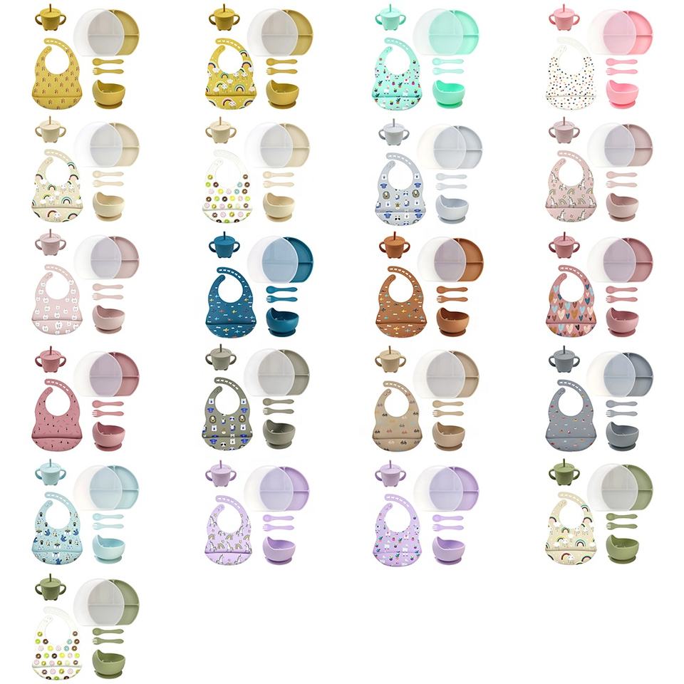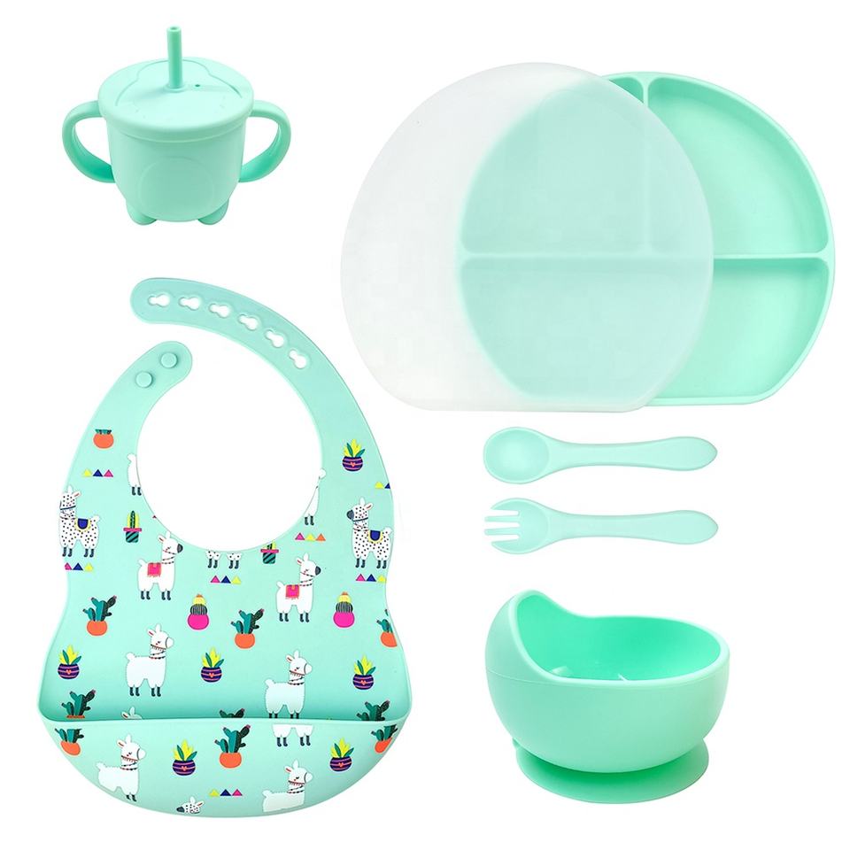 Nouveau design personnalisé ensemble de vaisselle en silicone pour bébés 7 pièces assiette à manger pour tout-petits avec couvercle et fourchette cuillère bavoir bol tasse