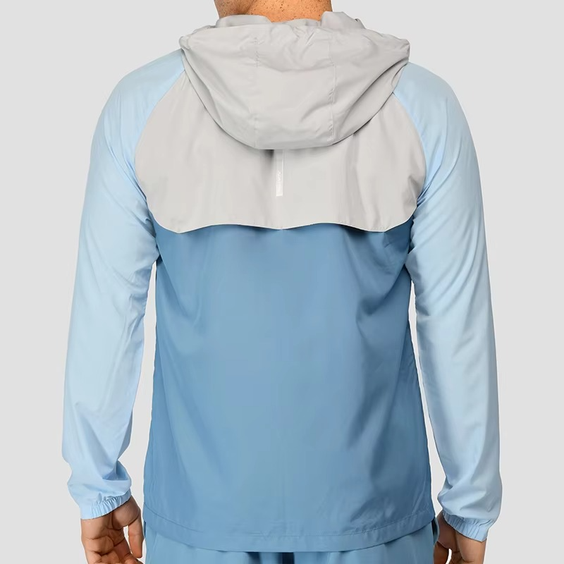 Nouvelle conception, fabricant personnalisé, 100% polyester tricoté, imperméable, respirant, à capuche, gris fumée, bleu acier, pour hommes