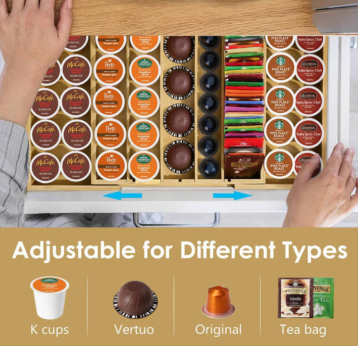 Nouveau modèle Porte-gobelet écologique en bambou K Technique polie Compatible avec les capsules Nespresso Vertuo Tiroir de support de dosettes de café