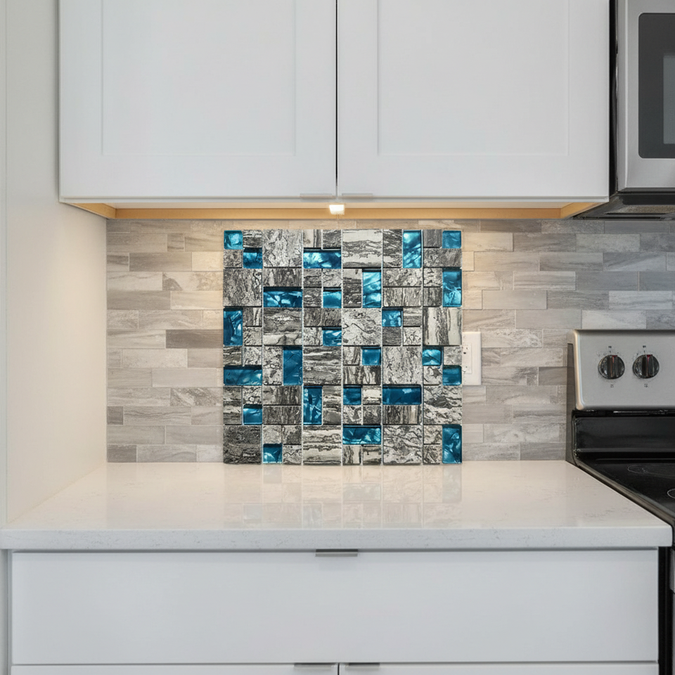 Nouvelle conception de mosaïque murale intérieure en marbre gris à texture ondulée européenne, mosaïque en métal bleu marine