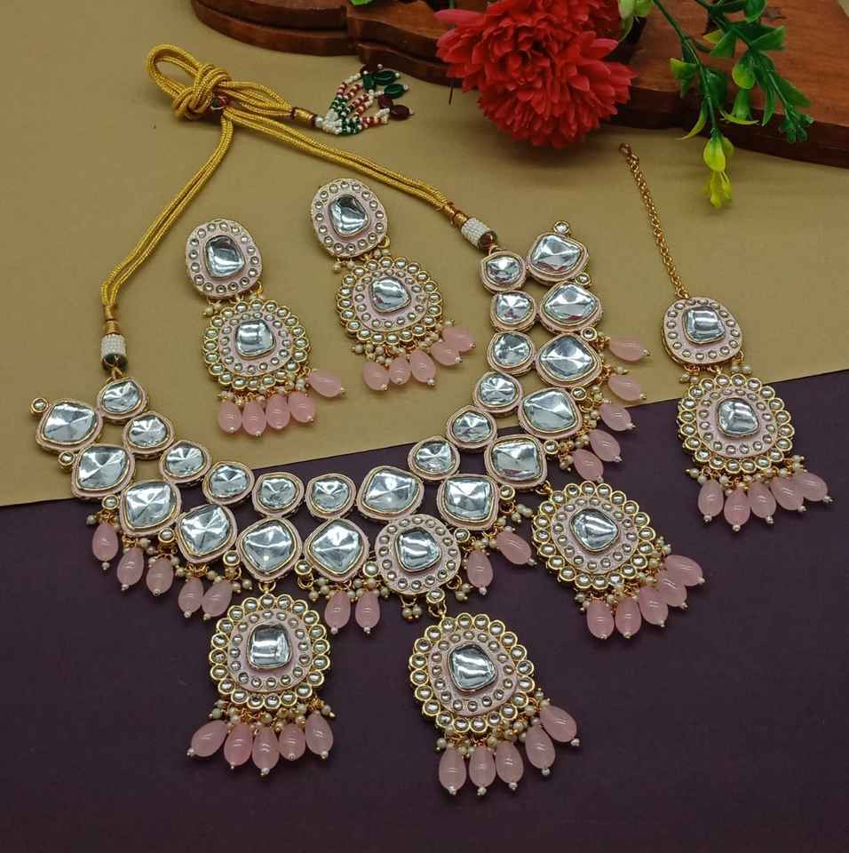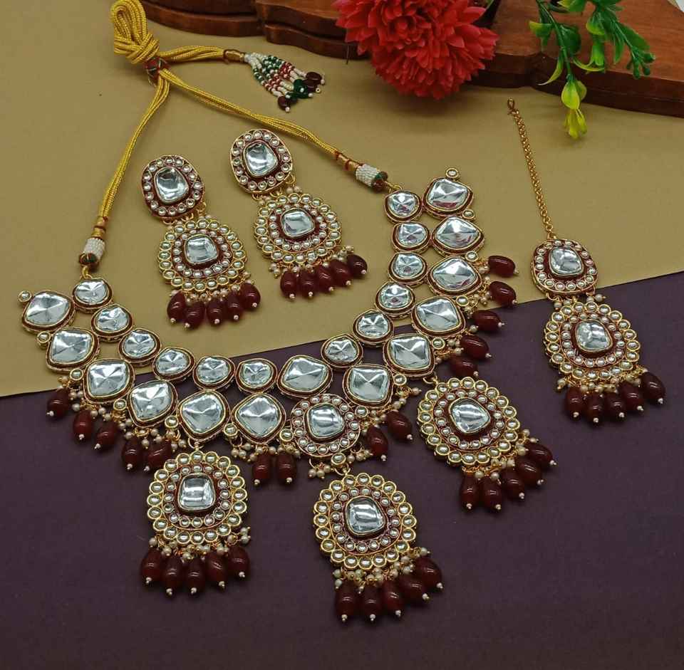 Nouveau design plaqué or traditionnel goutte perle et pierre cloutée boucle d'oreille Mangtika collier ras du cou ensemble et ensemble de bijoux pour femmes