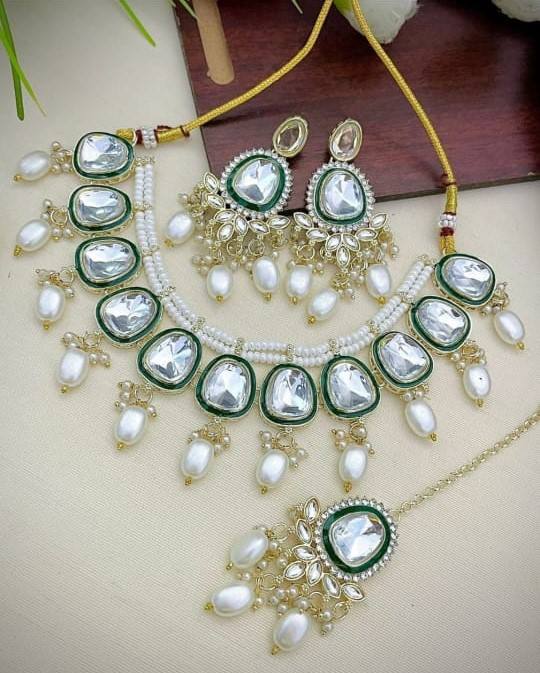 Type:Green Pearl & Kundan Studded Necklace Jewellery Set
