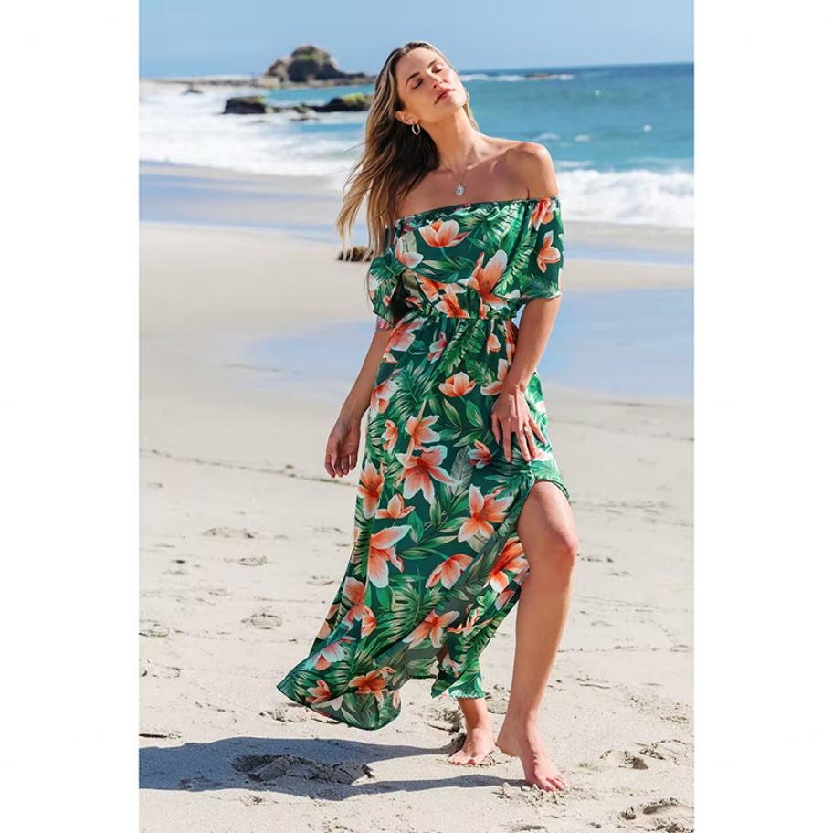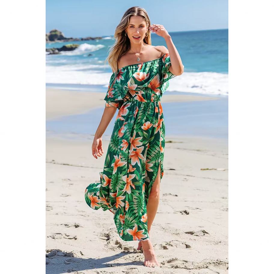 Nouvelle robe longue corset à volants, épaules dénudées, design tropical vert et orange