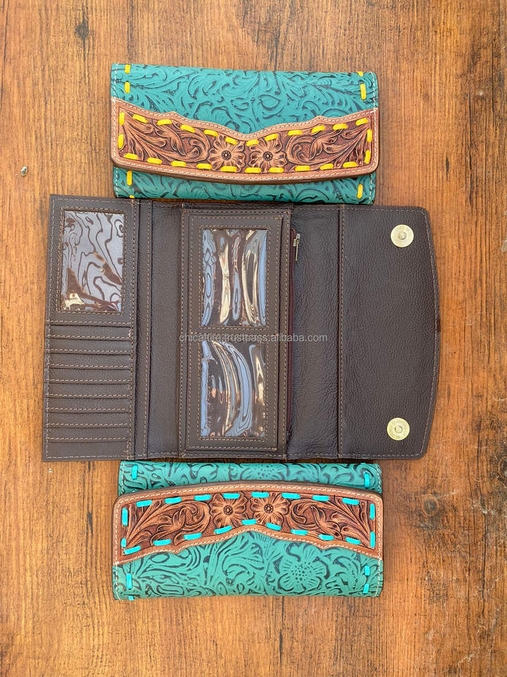 New Design Hand Tooled Carving Leather Wallet Clutch Phone Case Card Stylish Turquoise Color Wallet Multi Uses Western Leather