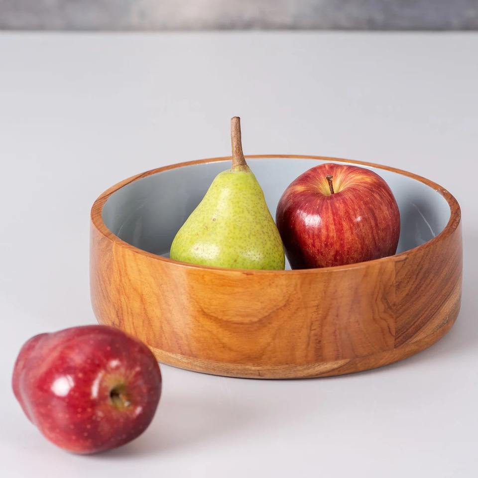 Nouveau design, bol de service plat en émail blanc fait main et petits bols de service en bois de manguier naturel pour les fêtes