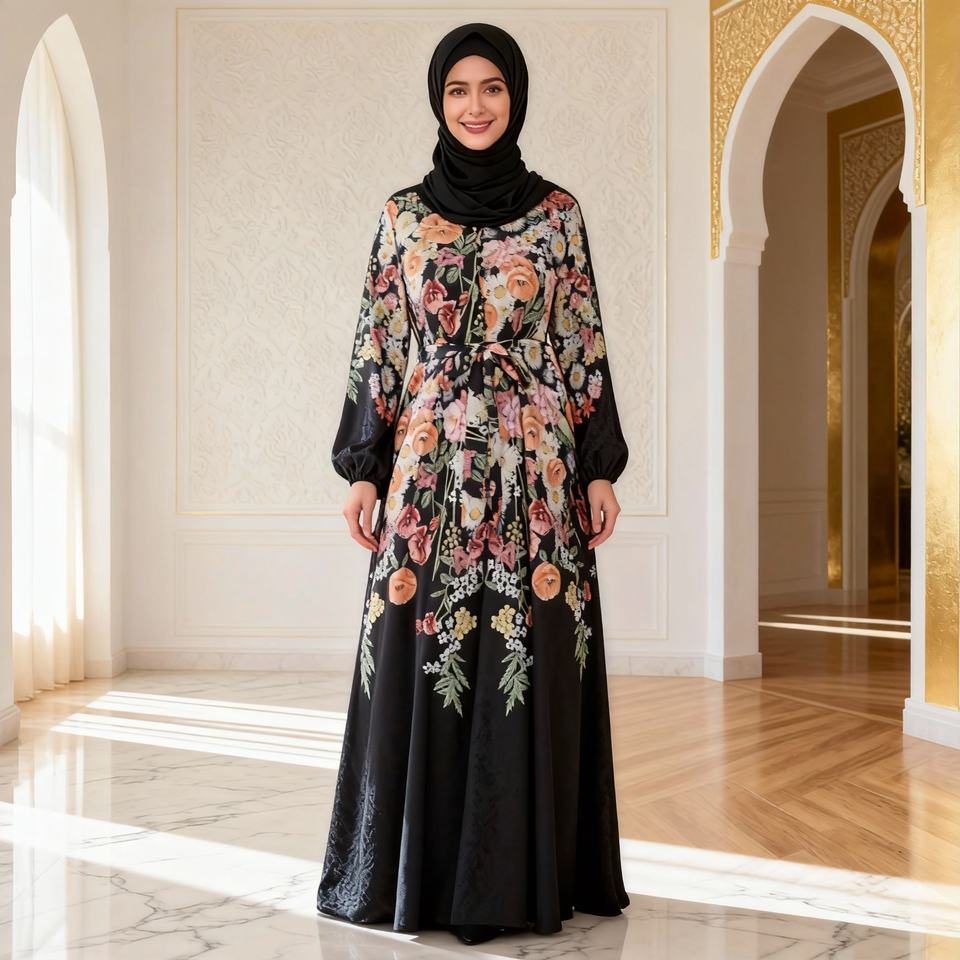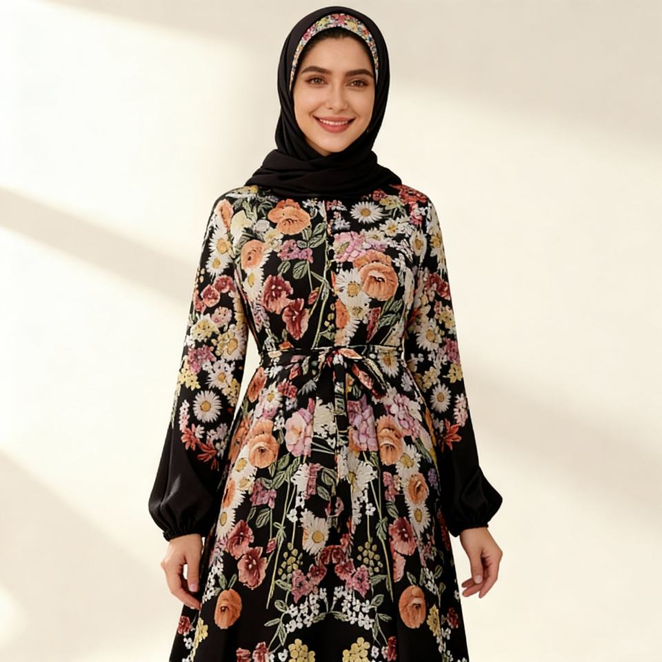 Nouvelle conception, tissu de haute qualité, imprimé de fleurs, abaya décontractée pour femmes musulmanes, robe de tous les jours, vente en gros