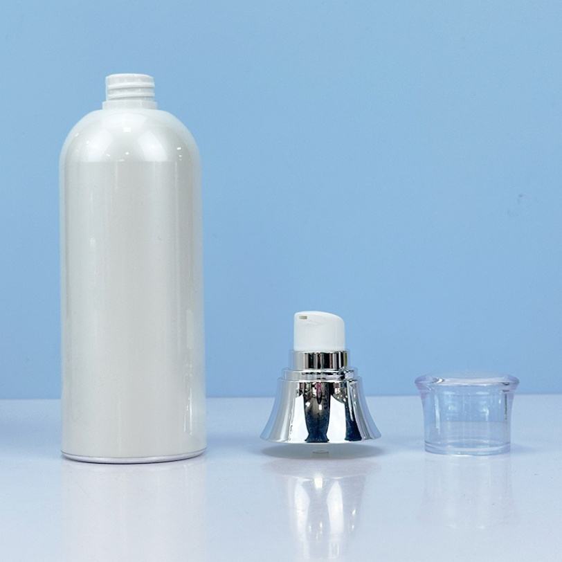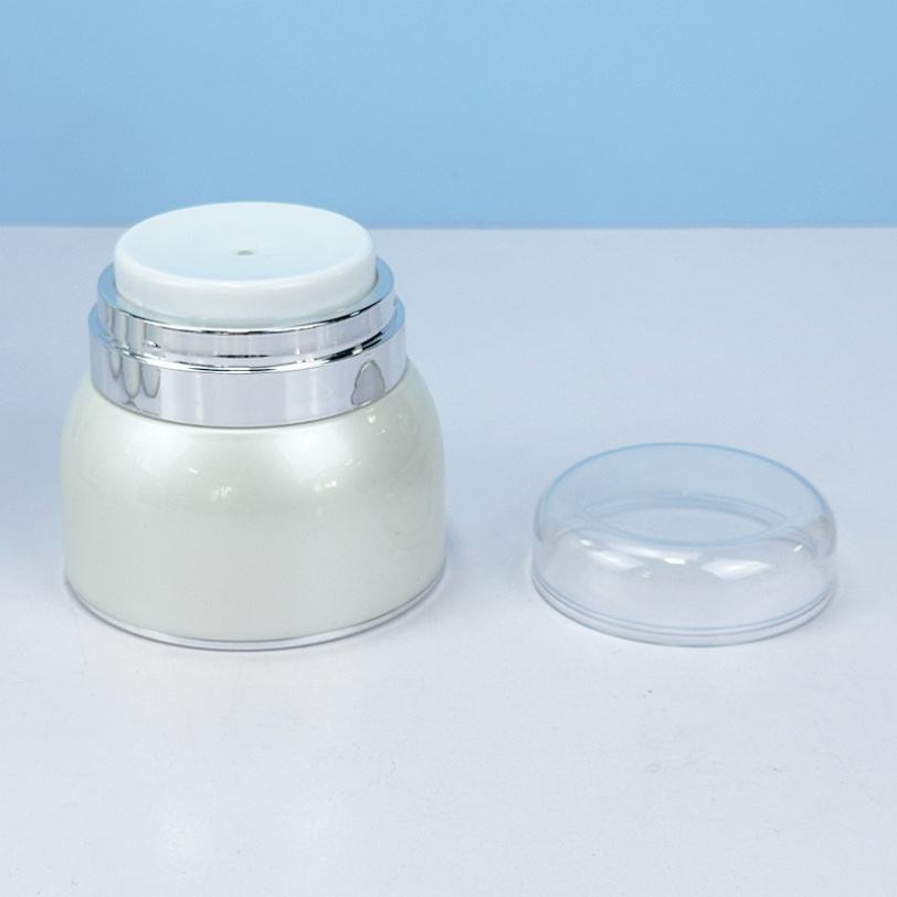 Nouvelle conception de luxe, ensemble complet d'emballages cosmétiques sans air, pot de crème pour le visage en acrylique blanc et flacon de lotion avec épaule argentée
