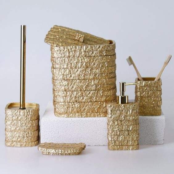 Ensemble de salle de bain doré de luxe nouveau design avec distributeur de savon et plateau porte-mouchoir Qualité et boîtes Personnaliser la taille et la forme Ensemble de 7