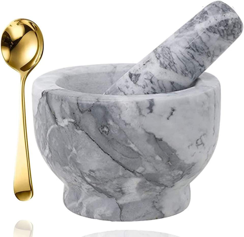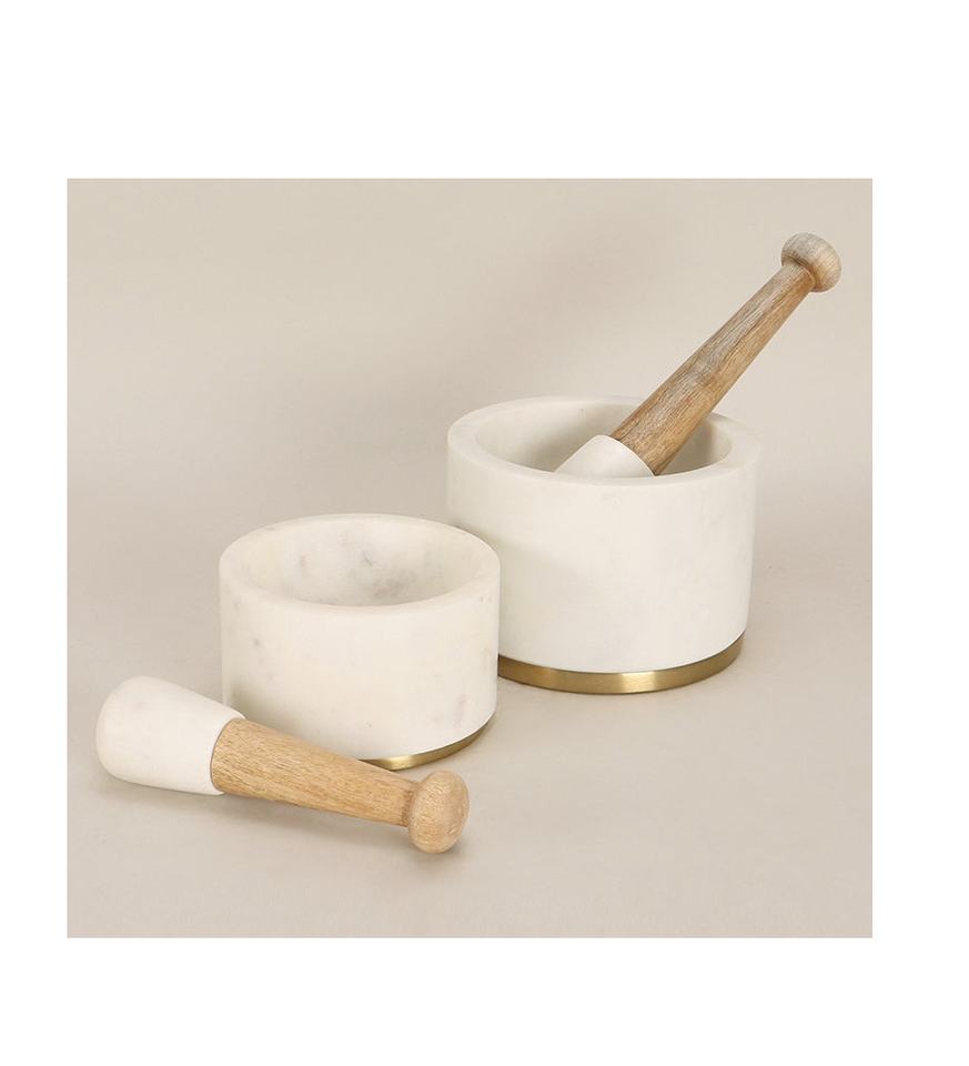 Nouveau design de mortier en marbre, pilon en bois et en pierre, taille personnalisée, 2 pièces de mortier en marbre avec base en laiton et pilon