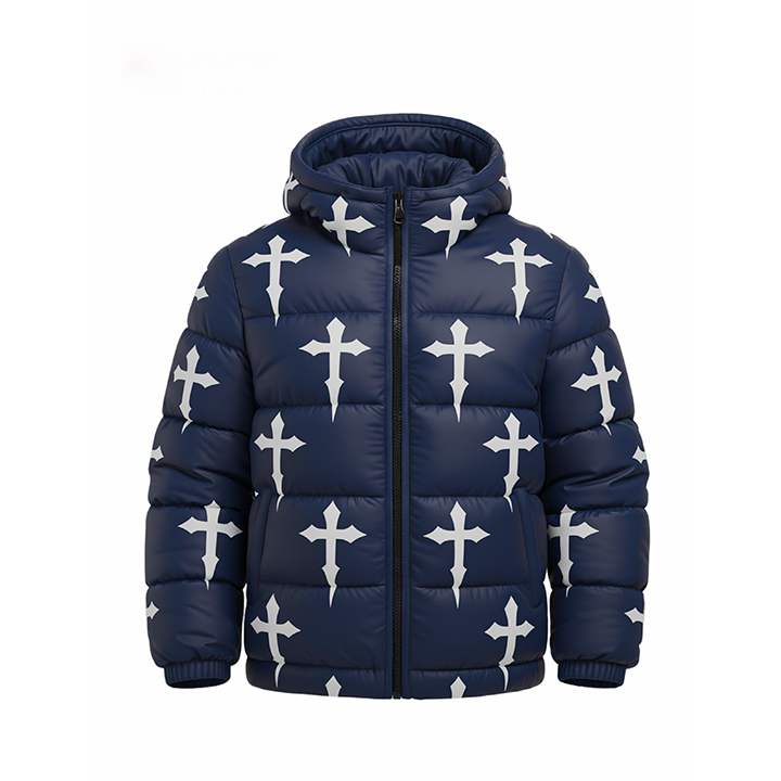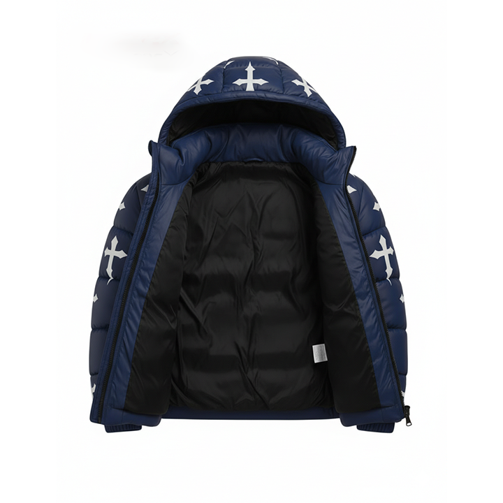 Nouvelle conception – Doudoune matelassée bleue à imprimé croix pour homme, avec capuche, manteau d'hiver bouffant, style streetwear, épais et chaud, personnalisable avec logo OEM