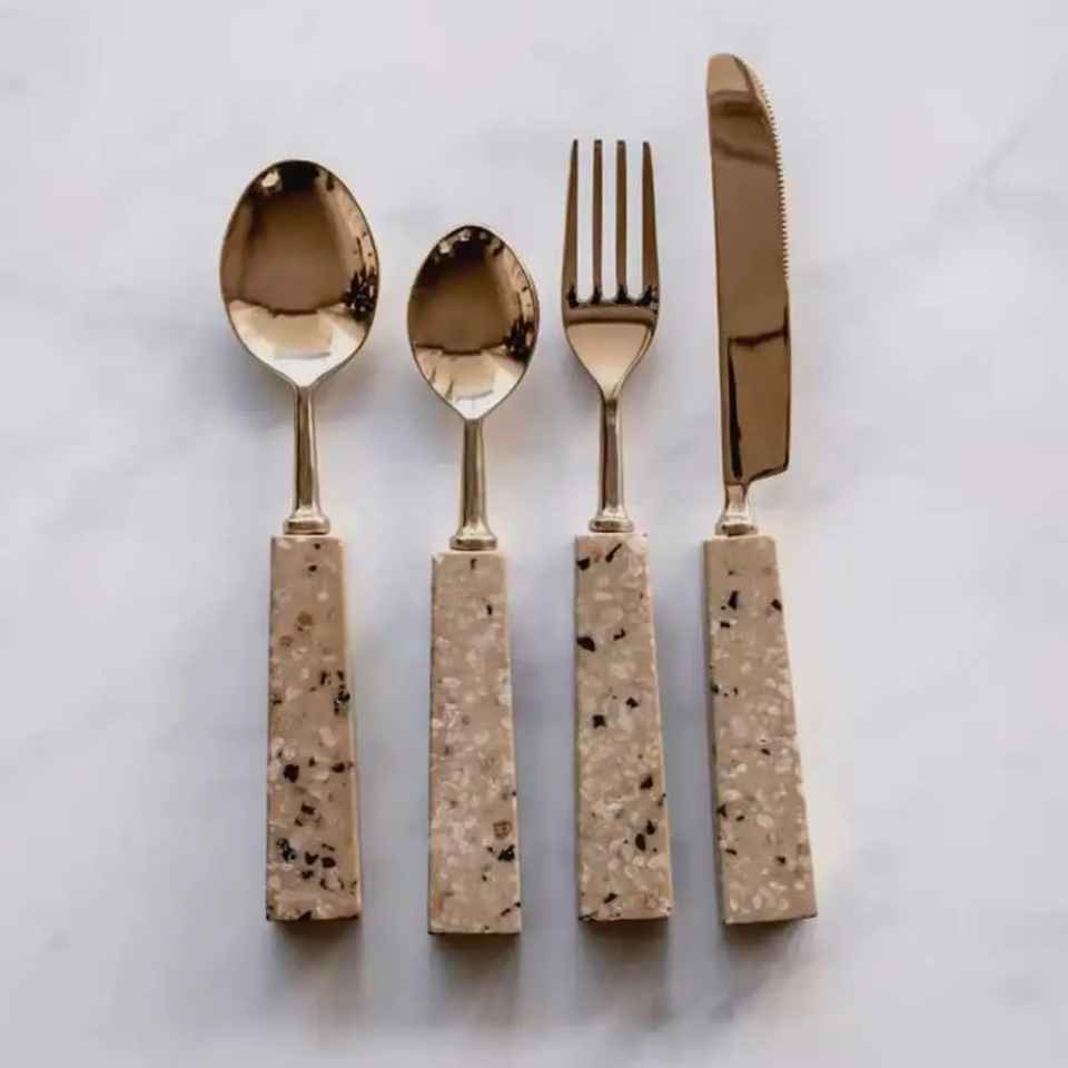Nouvel ensemble de couverts en métal durable au design moderne, avec poignée de luxe et finition polie miroir, en acier inoxydable, compatible lave-vaisselle, cinq couverts.