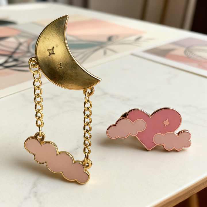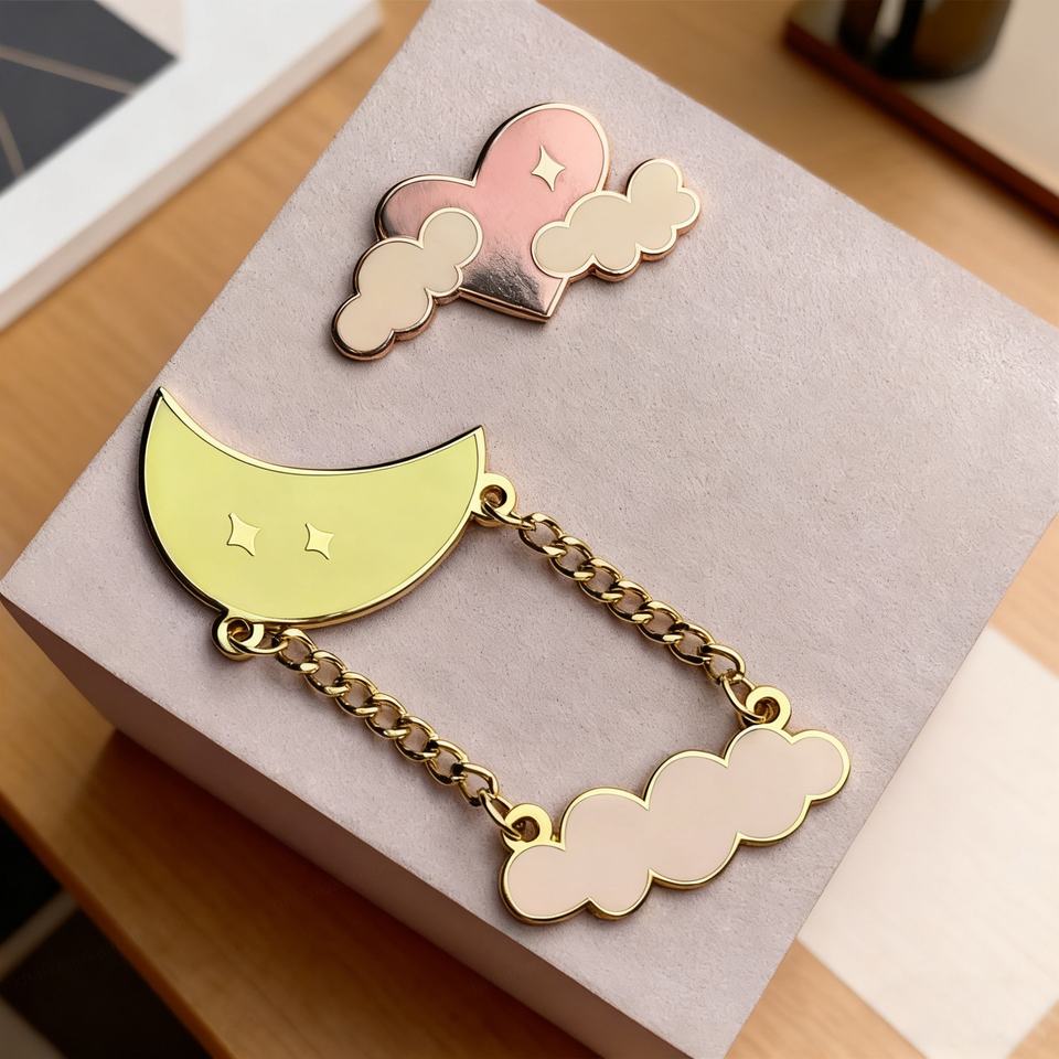 Nouvelle conception moderne, broche en émail avec chaîne dorée, vente en gros, badge personnalisé en alliage de zinc 2D pour la décoration de sacs et de vêtements