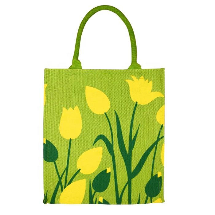 Sac en jute vert moyen écologique, imprimé sur mesure, nouveau design OEM, avec poignée longue et fermeture éclair, pour le shopping des femmes et des hommes