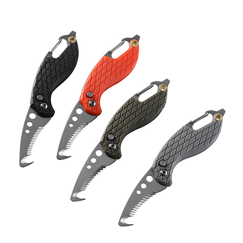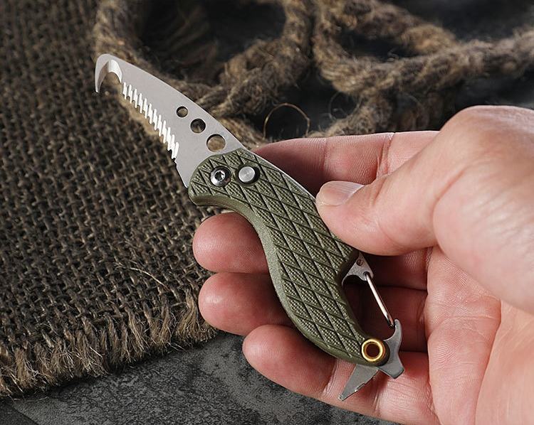 Nouveau design, couteau ouvre-boîte d'extérieur multifonctionnel avec crochet, lame dentelée, couteau pliant, coupe-ceinture, ouvre-bouteille, couteau porte-clés