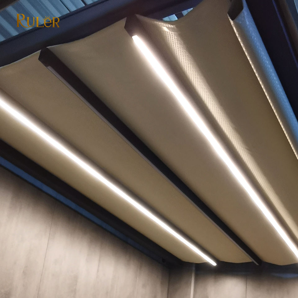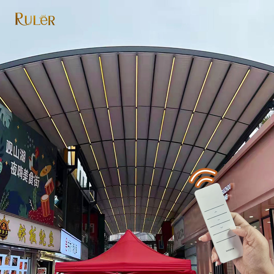 Nouvelle conception de gazebo pliable imperméable au soleil et à la pluie pour l'extérieur, auvent rétractable incurvé en PVC électrique avec lumières LED pour la place commerciale