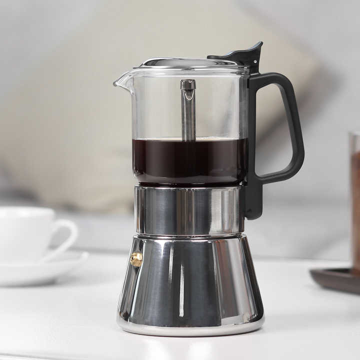 Nouvelle conception de cafetière à percolateur de style italien, en verre transparent et en aluminium, cafetière à moka, 6 tasses à expresso